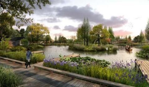 依托現狀地形地貌,打造親水平臺,結合用地規劃打造條狀小游園。